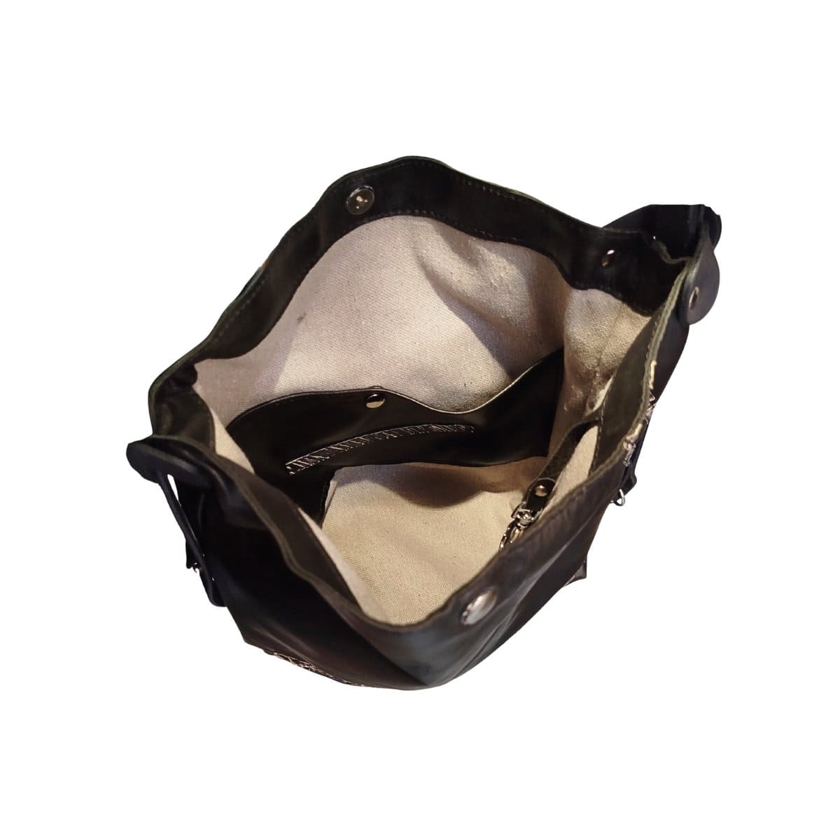 Doublé de coton bio recyclé, l’intérieur conjugue praticité et raffinement. Un mousqueton en inox, relié à un lacet de cuir assorti cousu dans le sac, accueille les clés en toute sécurité. Une grande poche plaquée de 25 cm sur 10 cm, divisée en deux compartiments, organise les essentiels, tandis qu’en face une poche de 24 cm sur 11 cm, fermée par un bouton de pression en inox et habillée du cuir fantaisie graphique, complète cet agencement élégant.